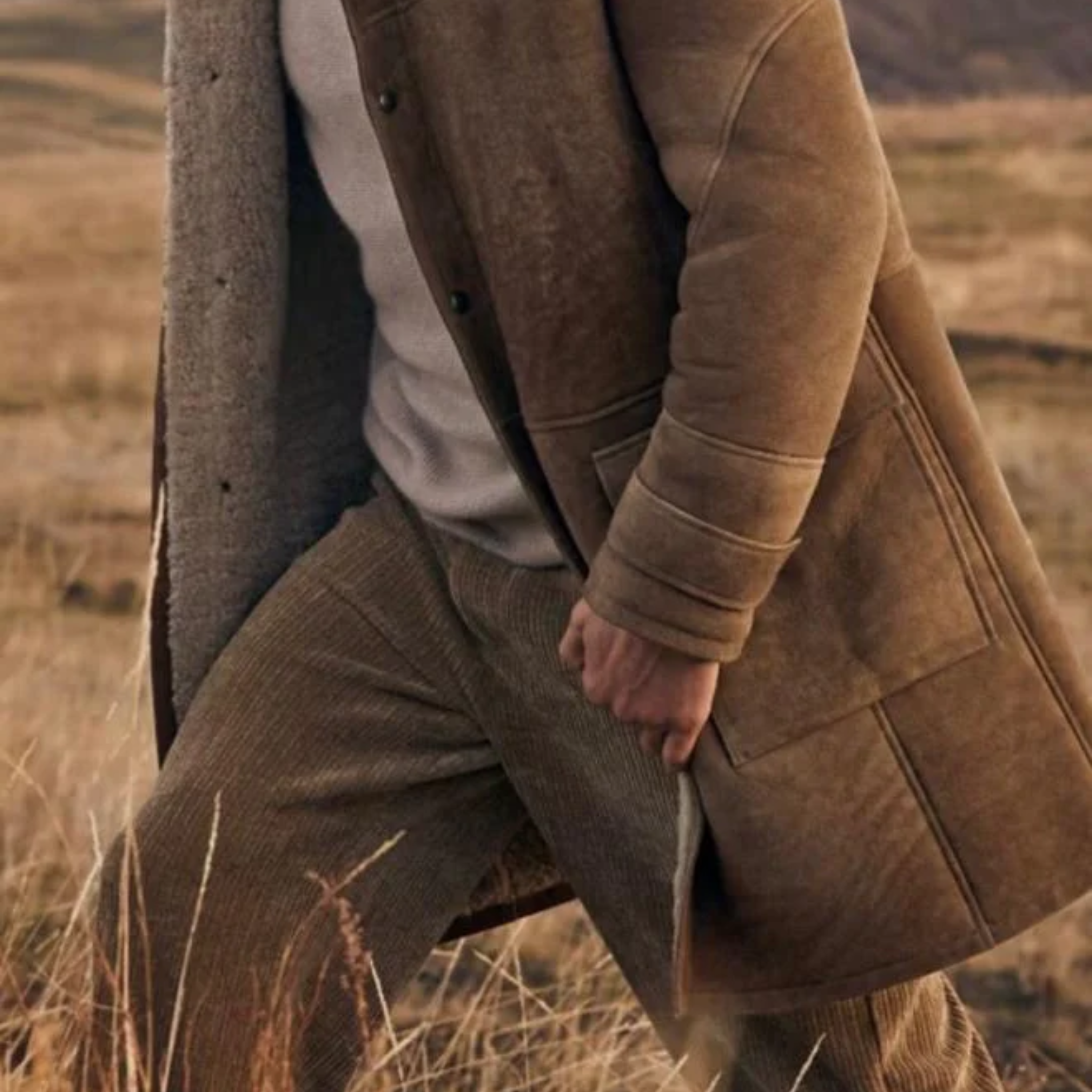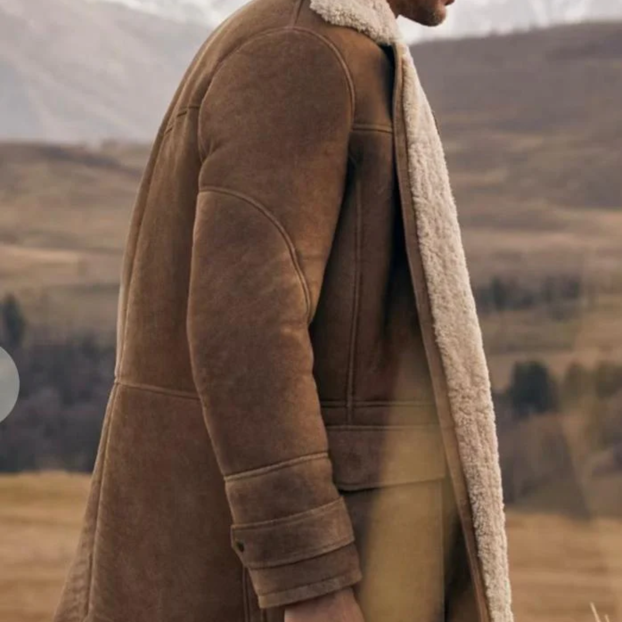 Men’s Suede Leather Long Winter Sheepskin Coat – Premium Shearling Warmth by Rove Leather