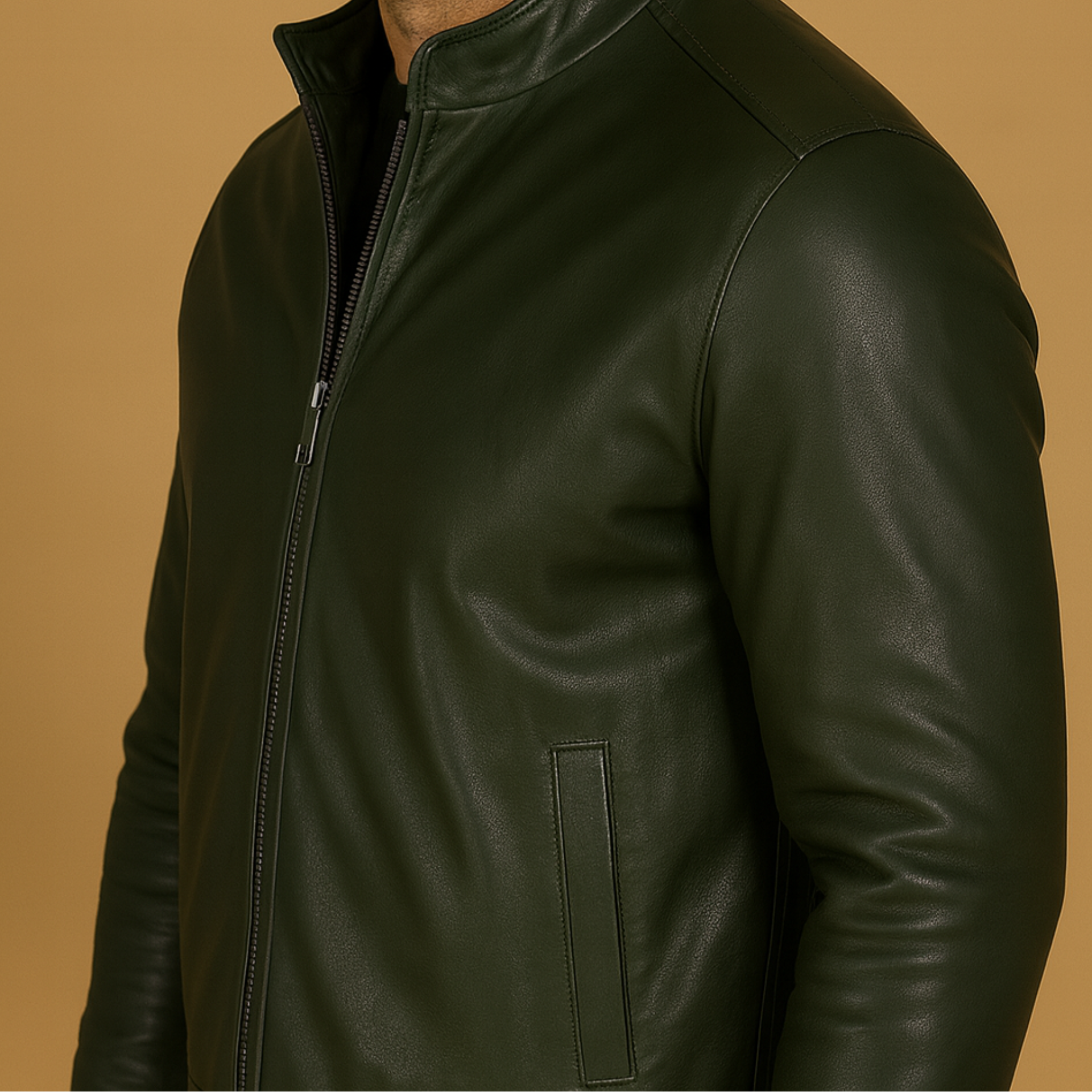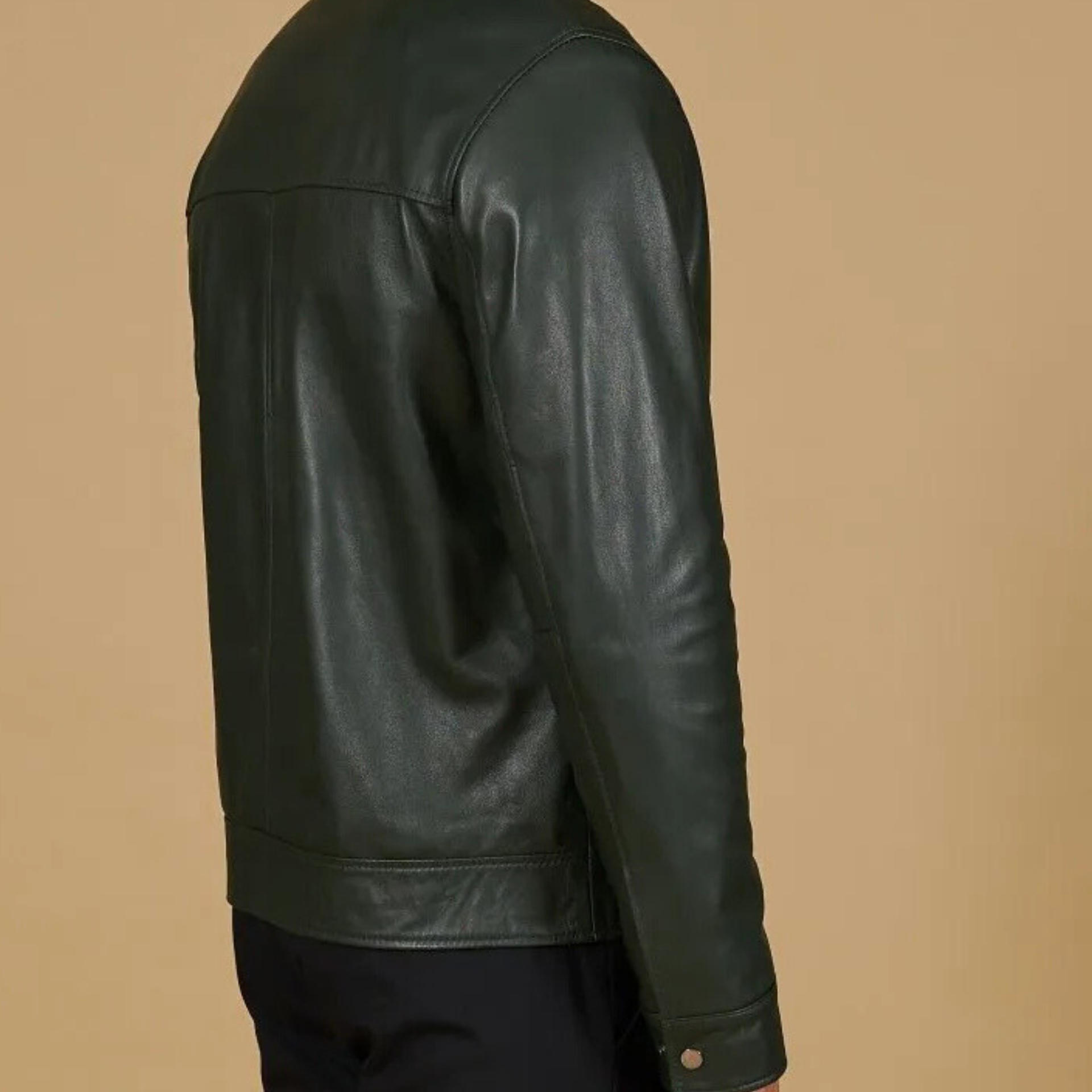 Some jackets shout for attention. The Rove Dracarys Green Lamb Leather Jacket doesn’t need to.